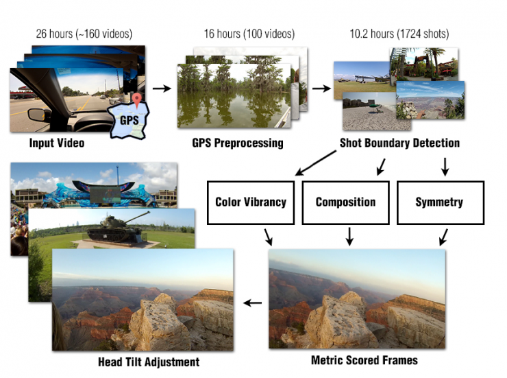The algorithm turned 26 hours of video into a 38-second highlight reel in three hours. Because Bettadapura had worn a head-mounted Contour Action Camera that captured GPS data, the algorithm could filter by geographical location. That reduced the footage to 16 hours. Shot boundary detection further reduced it into 1,724 video shots or about 10.2 hours of video. It then processed for artistic quality and provided an output of the most picturesque content. Processing time is variable and depends on the number of computers used.