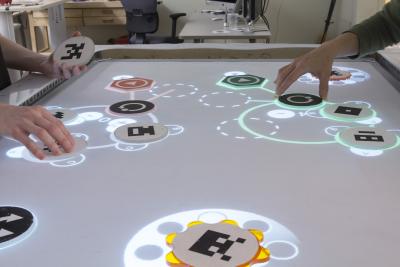 TuneTable’s interactive surface uses computer vision to detect printed markers — officially they’re called fiducials — on the coasters. Each coaster is assigned a sound or programming command, such as a splitter or repeater. People link them together to form a chain of electronic and hip hop sounds.