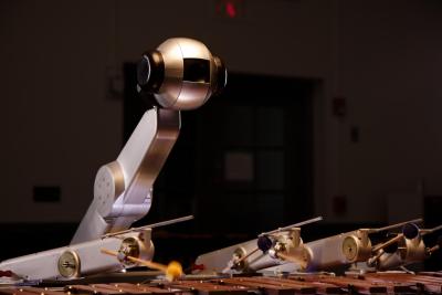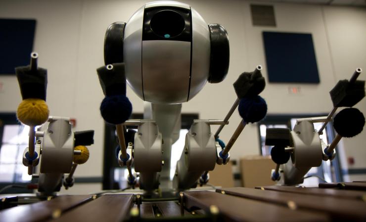 A marimba-playing robot with four arms and eight sticks is writing and playing its own compositions in a lab at the Georgia Institute of Technology. The pieces are generated using artificial intelligence and deep learning.